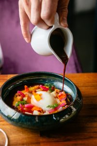 Les chefs Florian Barbarot et Pierre-Henry Lecompte ont ouvert le 10 octobre un bistrot dans le IXe arrondissement de Paris. Leur nouveau restaurant Quelque part... Chez nous s'installe au 48 rue du Faubourg Montmartre. Pierre-Henry Lecompte et Florian Barbarot se sont rencontrés en 2018. Le premier coachait le second, qui participait à l'émission Top Chef (Florian Barbarot a d'ailleurs encadré sa veste dans le bistrot). Ils se sont associés fin 2023 et sont aujourd'hui copropriétaires de la marque "Quelque part...". Ici, les deux chefs posent un regard contemporain sur des emblèmes de la cuisine française. "On est vraiment sur des classiques mais on s'amuse un peu sur certains plats, pour apporter de la technique et un peu plus de gourmandise", résume Florian Barbarot. "Le cochon-polenta est un vrai cochon-polenta", rassure le chef. Petites innovations à noter : le hachis parmentier est cuisiné avec du confit de boeuf et l'oeuf meurette est accompagné de haddock et non de lard. "Il régale nos clients", sourit Florian Barbarot. Pierre-Henry Lecompte et Florian Barbarot ont ajouté à la carte des desserts leur tarte citron meringuée aux suprêmes de citron infusés au thym, également vendue dans leur pâtisserie Quelque part... La Matière, qui se trouvait à cette adresse et a déménagé juste à côté, au 1 rue Buffault, dans l'ancien local de production, lui-même déplacé à l'étage du bâtiment.